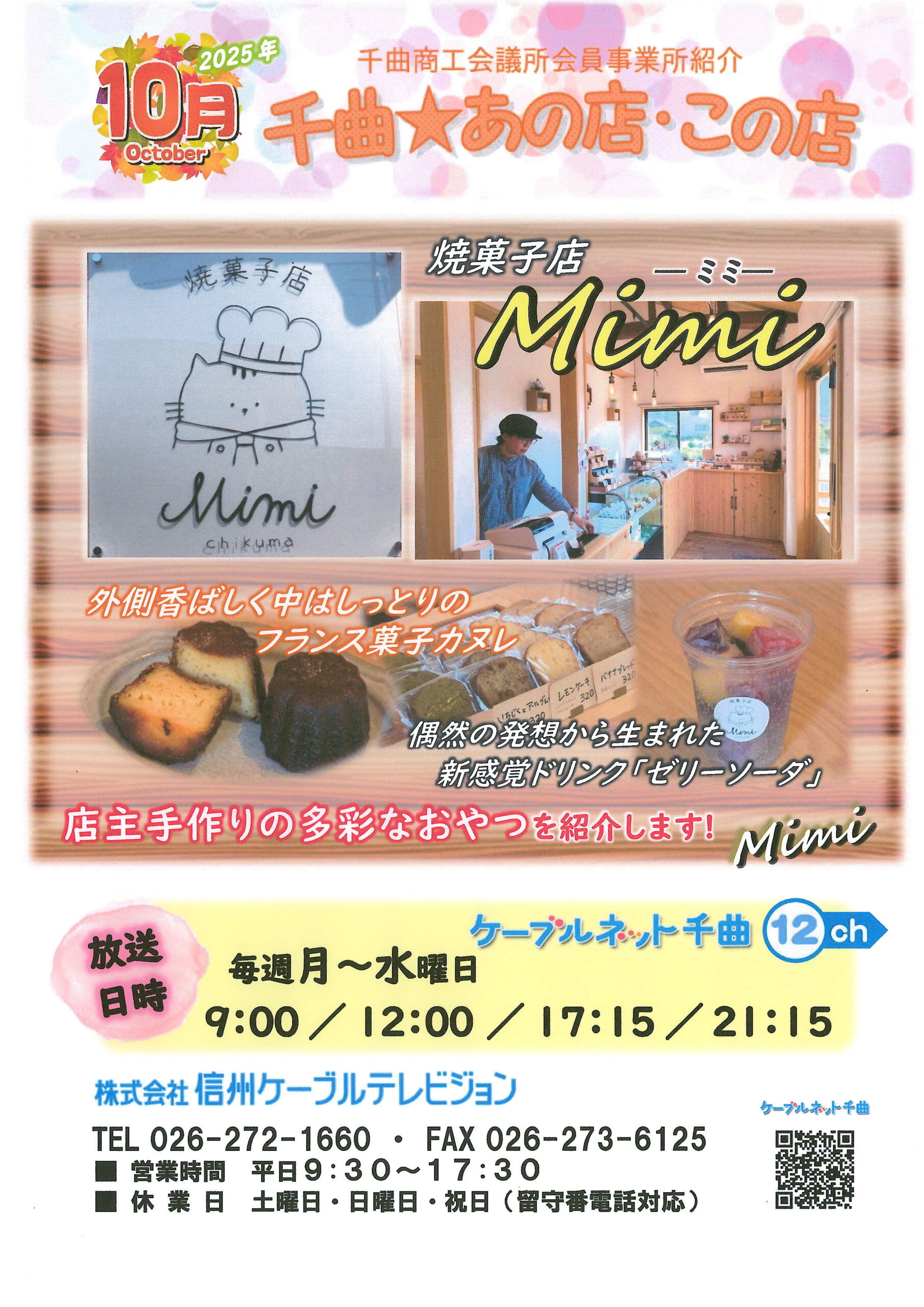 千曲商工会議所会員事業所紹介『千曲☆あの店・この店』 10月は、千曲市内川の「焼菓子店Mimi」様をご紹介します。 放送はケーブルネット千曲 12ch 毎週月曜日~水曜日 9:00~/12:00~/17:15~/21:1 […]