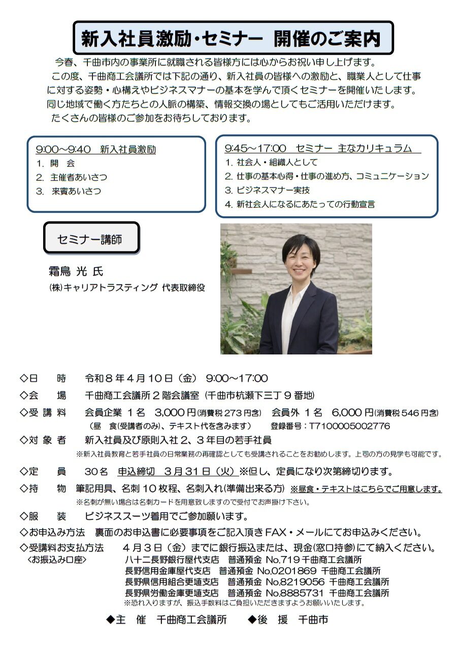 新入社員激励・セミナー 開催のご案内 2026年3月2日 商工会議所からのお知らせ by tanaka-ken. 申込書のダウンロードはこちらから↓ 新入社員激励・セミナー 共有:Tweetいいね:いいね 読み込み中… 関連 前の記事