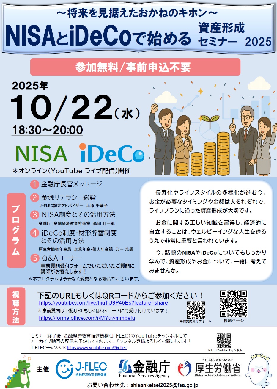 NISAとIDECOで始める 資産形成セミナー2025 オンライン開催のご案内 2025年10月8日 お知らせ by tanaka-ken. 以下よりチラシをダウンロードいただき、 各自でご覧ください。 事前受付不要で、どなた様でも参加することができ、 参加費は無料です↓ 資産形成セミナー(オンライン)チラシ 共有:Tweetいいね:いいね 読み込み中… 関連 前の記事
